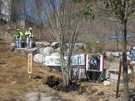 快晴の中、4月24日(日)午後1:30〜植樹が行われた【足尾の山】の銅親水公園では【故立松和平氏の記念植樹】とその献土が厳かに行われました。現在の【足尾の植樹】が【足尾に緑を育てる会】主催で行われるようになった創設当時からの主要メンバーであった立松和平氏の【記念碑】の計画があります。今回の追悼植樹のあった場所に建立する計画ですが、【足尾に緑を育てる会】では現在その支援金を募っています。