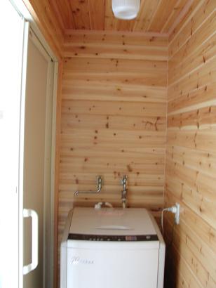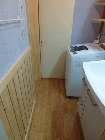 脱衣所:サンウエーブ高耐久タイプ 床:ナラ無垢板フロア、天井・壁:パイン・羽目板