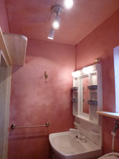 器具はミラー、照明取替え、内装はスイス本漆喰カルクウォール左官塗り他
