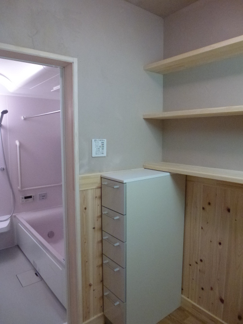 浴室・洗面室の温熱環境改善、作業性良く器具配置替え+収納力UPの脱衣室