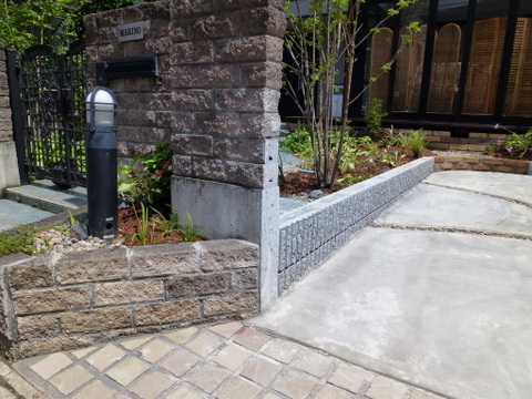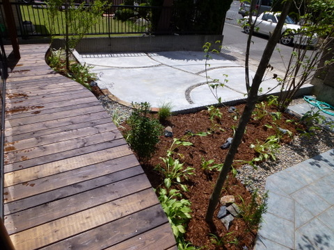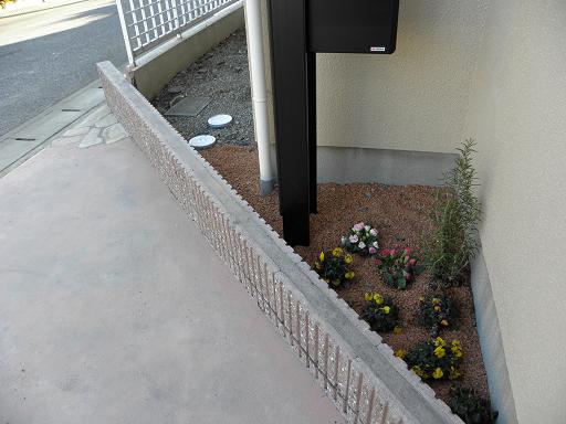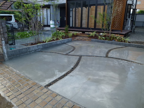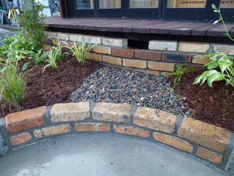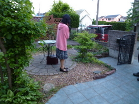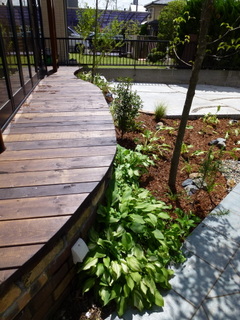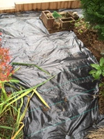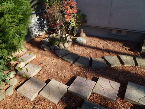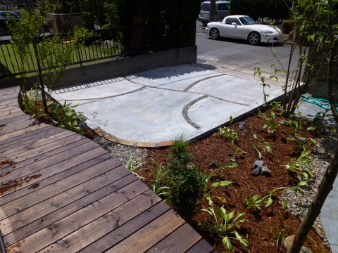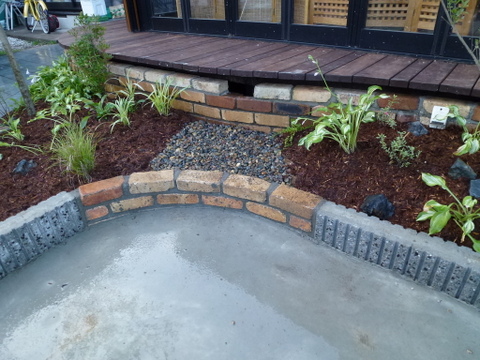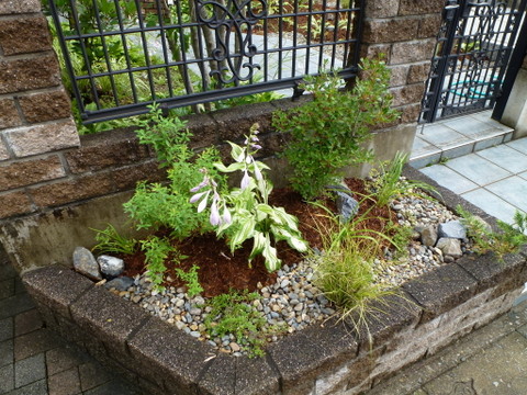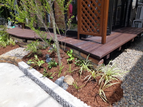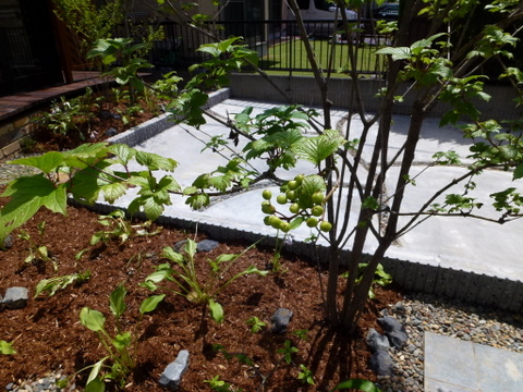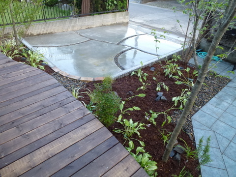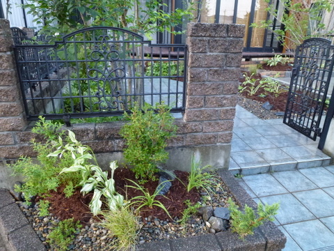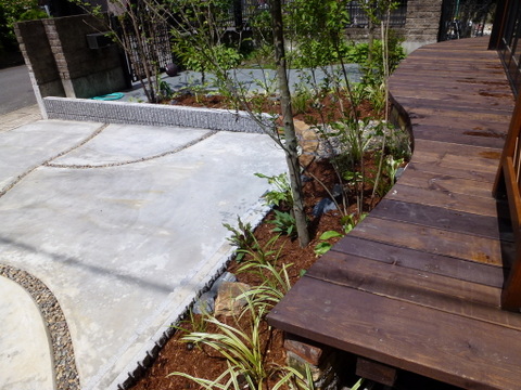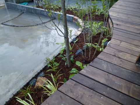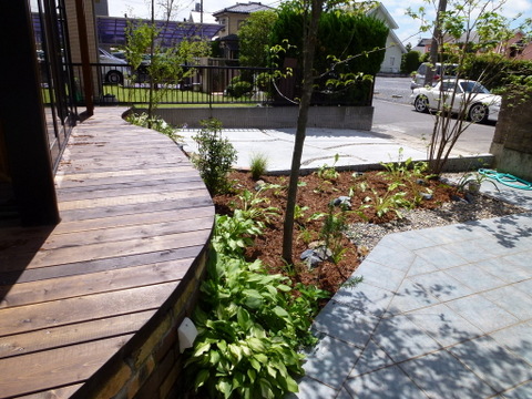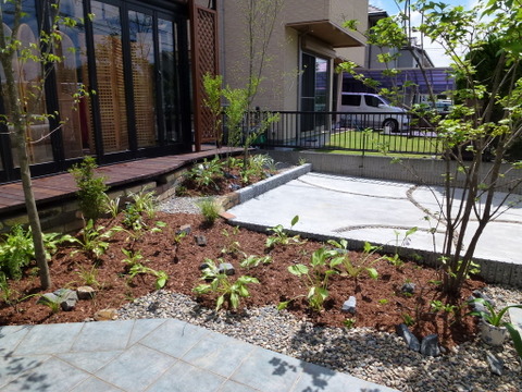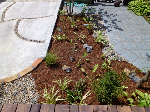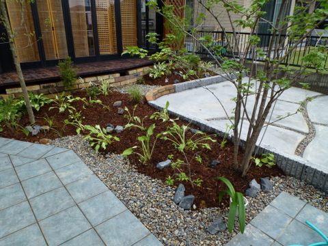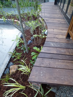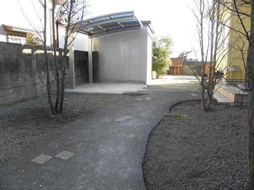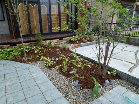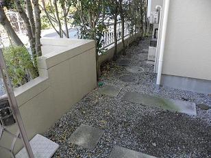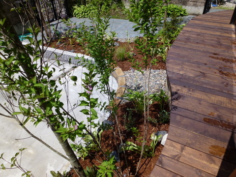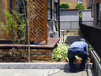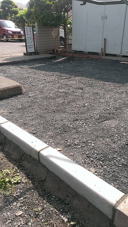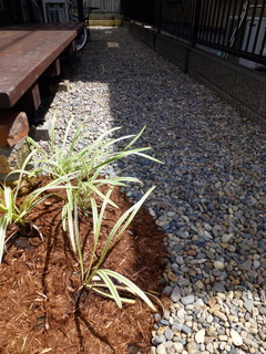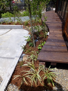 隣地(園路三面)は防草シート+六分砂利敷き込み(鬼怒川砂利)
