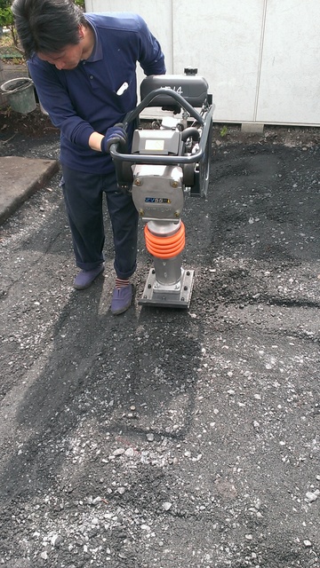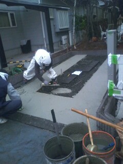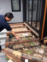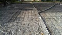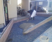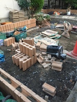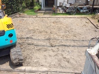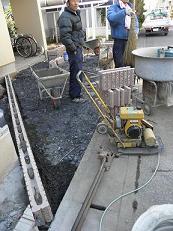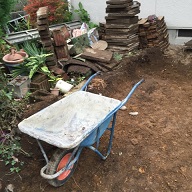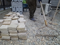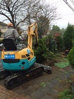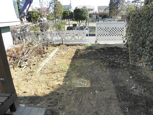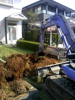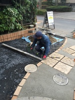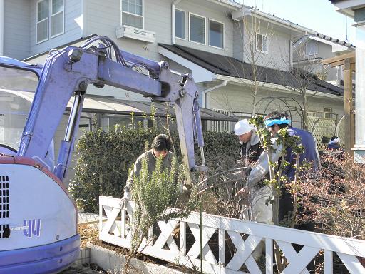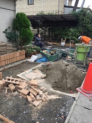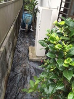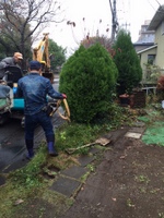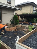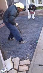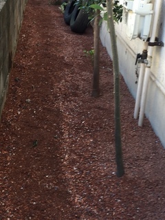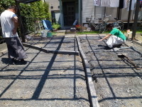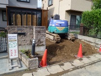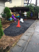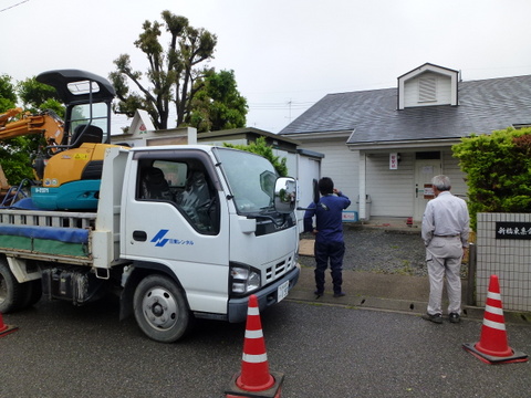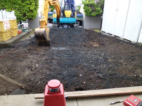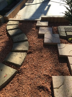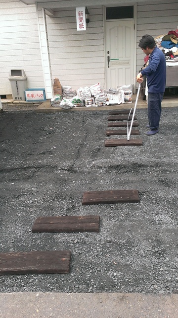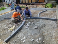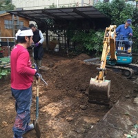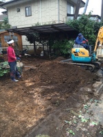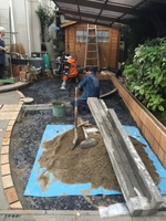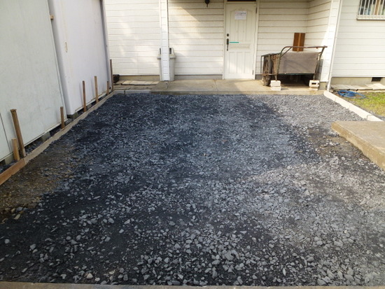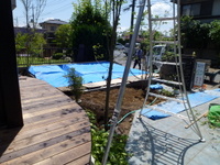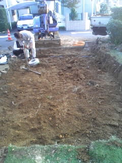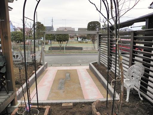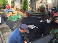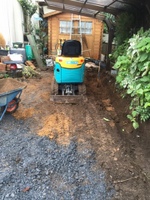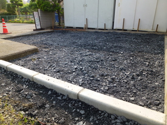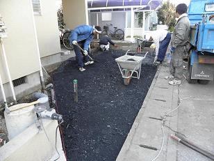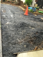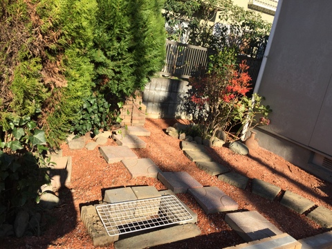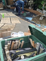 駐車場から続く、北側園路の掘削、防草シート張り、瓦チップの敷き込み