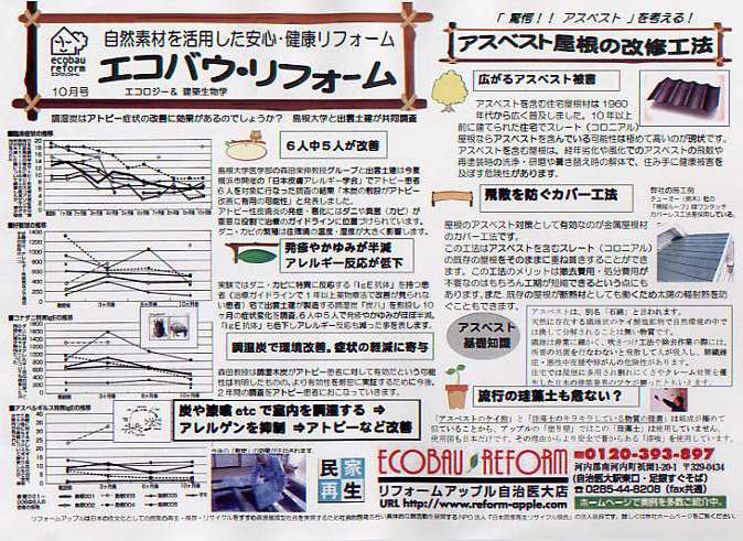 調湿炭が床下の調湿効果に強い期待 :出雲の敷き炭「炭八」 ・・・素材そのものが持つ調湿特性を活かす 出雲土建の「炭八」 島根大学の森田教授と出雲土建が横浜で行なわれた「日本アレルギー学会」で床下木炭の敷き詰め効果 について研究発表をおこないました。 アトピー患者を対象に行なった実地検査で、アトピー性皮膚炎の発症・悪化に対し、木炭の床下敷き詰め が室内環境の改善に役割を果たし、アトピー改善に有効であることを証明しました。 エコロジー&バウビオロギー・リフォームのトップへ戻る