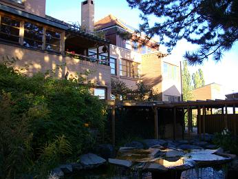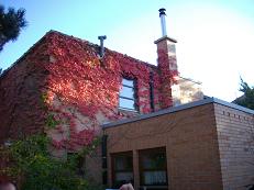 紅葉したツタが壁面を覆う。屋上に設置された【ソーラーコレクター・太陽熱温水器】での温水と木チップを燃料とした