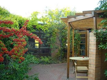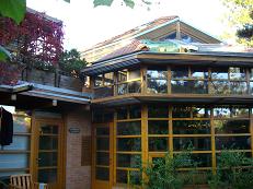 緑に覆われた庭とウインターガーデン(サンルーム)。地下に降りるとコンポストトイレのタンクがあった。生活排水は