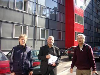 ルチードシステムと呼ばれるダンボール断熱材を透明ガラスですっぽりと包み込まれた集合住宅前で、建築家とケーニッヒ氏と石川教授