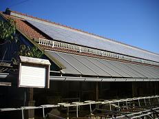 これは豚舎ですが、牛も豚も平飼いされ、のびのびと育っている。豚舎の屋根にはソーラーコレクター(太陽熱温水器)が設置されている。