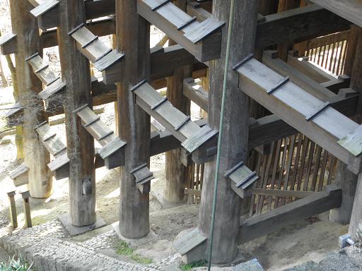 舞台を支える柱は基礎石の上に立つが、長年の侵食で石が剥き出しとなり危険な箇所も見られる 本堂の?屋根の改修も行われるがいずれも難工事が予想される