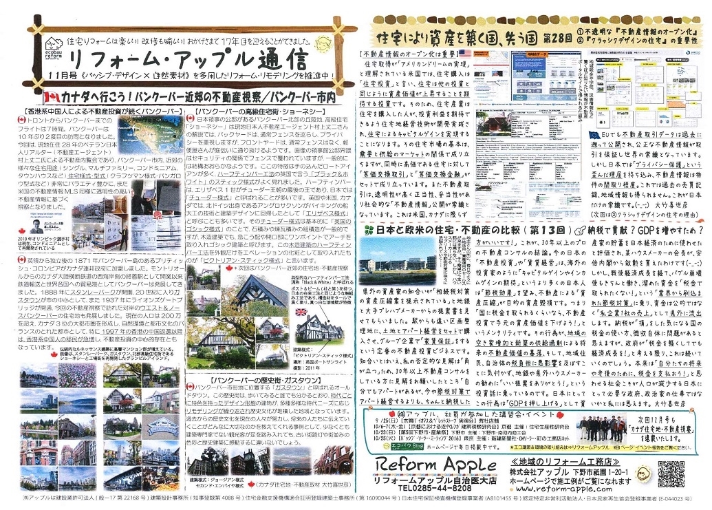 ![]() カナダ中部・トロント〜西部・バンクーバーまでは7時間のフライト ![]() 【バンクーバー市内】 【スタンレーパーク】 オールドタウン【チャイナタウン・ガスタウン】 【バンクーバー北部・ショーネシー】 【グランビルアイランド】 ジョージアン様式 フェデラル(連邦)様式 ![]() 【ジョージアン様式】 英国ハノーバー朝の国王ジョージ1〜4世の時代、1600年代半ばに英国で普及した建築様式 建築マニュアルで米国に伝わり威厳あるデザインは裕福移民の間でブームとなり米国のコロニアルスタイルとしてニューイングランドと南部の植民地で定着した。 【フェデラル(連邦)様式 米国で連邦制度が成立した18世紀後期から19世紀に普及し、連邦フェデラル様式と呼ばれる ジョージアン様式をベースに優雅で洗練された装飾が施され、縦に長く伸びた窓やパラディアン窓などの優美なフォルムが特徴となっている。 コロニアル様式が普及した後にアメリカで広まった。 【資産価値を失わない欧米の住宅地】 オーストリア・タッテンドルフ ドイツ・ダルムシュタット郊外 英国・ポートサンライト ドイツ・フライブルク 【資産価値を失わない欧米の住宅金融・モゲージローンの概略図】 米国 英国![]() ![]() 【米国・TND開発に多いクラフツマン様式のバンガロウ型式】 【チューダー様式】 【スパニッシュ・コロニアル様式】 ![]() 【資産価値を失わない欧米の住宅地】 【パッシブハウスの概念図】 ![]() 【スマートハウスの概念図】 ![]() ![]() ![]() 2011-12年:海外視察地の現地からのリアルタイムBlog 米国リモデリング&ニューアーバニズム建築視察・バックナンバー2011年10月12日〜19日 2011年・もう一つの海外からのリアルタイムBlog 英国&ドイツ建築視察・バックナンバー2011年7月7日〜14日 ![]() 【自然エネルギーは太陽光発電だけではない:電力自由化と賢い政策で大躍進のドイツ】 太陽光発電は家庭の屋根に限らずスーパー・オフィス・学校・農場などより【大規模な場所】に事業として展開され、メンテナンスし易い壁面取付けが多い。日本のように画一的に【家庭の屋根】に・・・という政策ではなく真の意味で【電力自由化】が実現した風景である 電力の省エネに限らず、生活のあらゆる場面で無駄が省かれている。 日本やアメリカほど利便性が追求されていないヨーロッパでは、例えば車のカーシェアリングの普及も多く、専用の駐車場もある。 自転車が多いのは短絡的に「国民性」という言葉では決して片付けられない共同社会に暮らして質素倹約を基本とする生活習慣と、国の賢い政策運営が微妙に絡んでできたものである。 原発反対の旗は普通の家屋にも掲示されコミュニティーで運営されるウインドファームもよく目にする光景である ![]() |