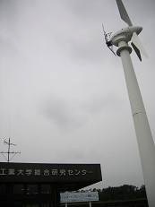 足利工業大学・総合研究センターの正面の風力発電機、自然エネルギー取組の掲示