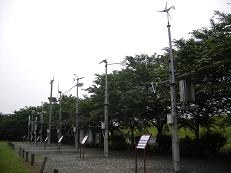 風の広場、自然エネルギー広場は内外メーカーのいろいろな工法の風力発電機が並ぶ