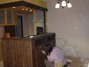 | 【Before】 【施工中】 キッチン台を組み、古材も取付け、LD側のカウンターもインストールして周辺を造作 仕上げ:弊社インテリアコーディネーターが詳細を現場で指示 古材に合わせて周りの造作家具なども自然塗料リボス+京都山中油店の鉱物顔料で着色 左官:カウンター天板、袖壁 天板の左官:クリスタルインレイ使用、蜜蝋で撥水加工 袖壁の左官:スイス漆喰、カルクウォール、エイジング加工 【After】 |