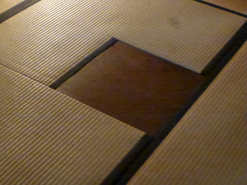 よくある普通の和室 「古材の柱」で作った「自在ガキ」をぶら下げ、囲炉裏風の設えに。