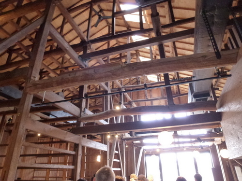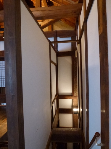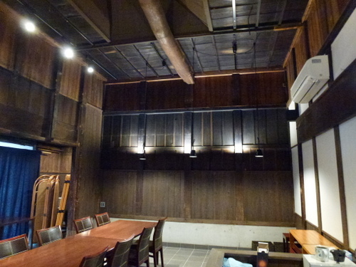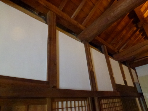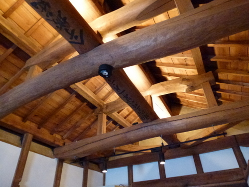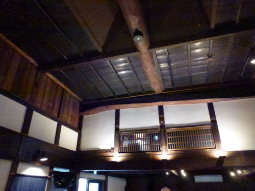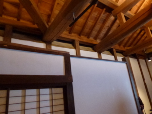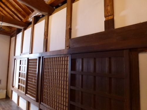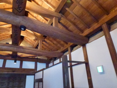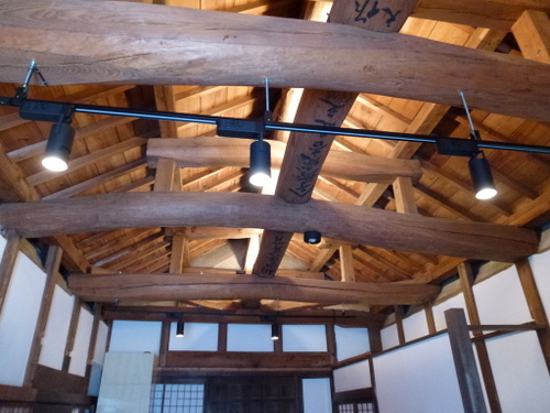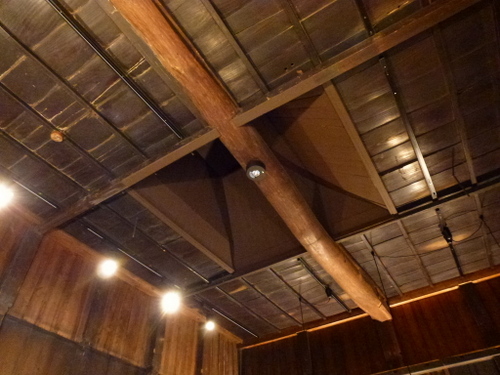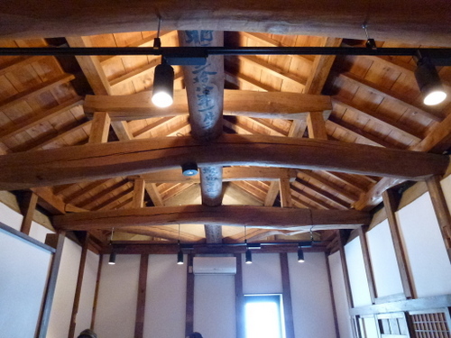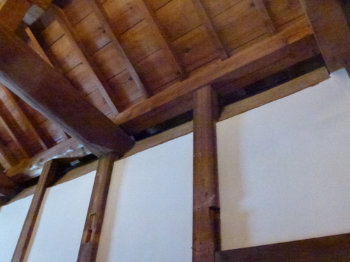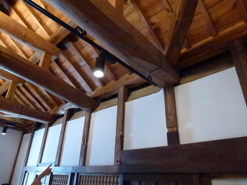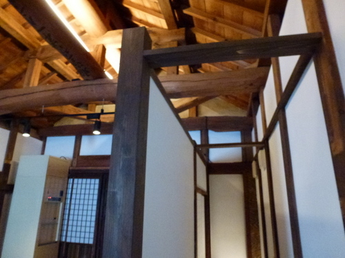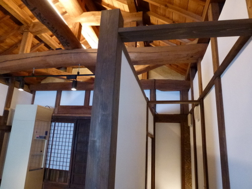 当時の貫工法(在来工法の原型)や竹小舞の土壁。地場の欅と松の曲がり梁が素晴らしい。