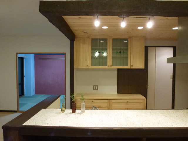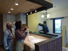 | 【Before】 【施工中】 キッチン台を組み、古材も取付け、LD側のカウンターもインストールして周辺を造作 仕上げ:弊社インテリアコーディネーターが詳細を現場で指示 古材に合わせて周りの造作家具なども自然塗料リボス+京都山中油店の鉱物顔料で着色 左官:カウンター天板、袖壁 天板の左官:クリスタルインレイ使用、蜜蝋で撥水加工 袖壁の左官:スイス漆喰、カルクウォール、エイジング加工 【After】 |