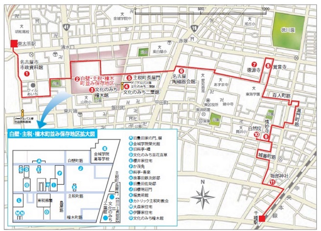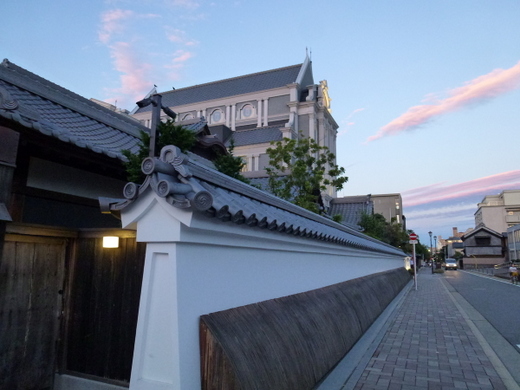 名古屋市に残る武家屋敷町を散策してまいりました。名古屋市の東区にある現在も残り「街並み保存地区」に指定されている主税町(ちからまち)、白壁地区には、江戸時代の中流の武家屋敷が並んでいました。初代尾張藩主・徳川義直に仕えて勘定奉行を勤めた野呂瀬主税が、この地に屋敷を構えたことから主税町と名付けられています。もともと主税というのは、「大言海」によると、田力(たぢから)、田租(でんそ)などの意味があり、民の力で耕作地を耕し奉る物、すなわち税を納めるという意味があり、税は力なりいう意味です。明治、大正、昭和の時代の建物が続く歴史文化を醸し出す美しい景観を見ながら、夕暮れの主税筋をいてみました。現在、この主税・白壁・撞木は「街並み保存地区」に指定されており、武家屋敷散策コースとしては、観光地化されているわけではなくひっそりとした高級住宅街の上質な雰囲気が漂っていました。この武家屋敷の面影をしのばせる主税町・白壁町筋と、今回は時間の関係で散策できなかった藩政時代の名残をとどめる百人町・黒門町あたりもぜひ次回は訪ねてみたいと思います。スタート地点の名古屋市市政資料館は、名古屋控訴院・地方裁判所・区裁判所庁舎として大正11年に完成したレンガ造のネオバロック様式を基調としたルネッサンス建築であり県指定の重要文化財です。この主税・白壁・橦木町並み保存地区は、名古屋城の東にあたる中級武士の屋敷町ですが、風格ある門や塀が多く、明治以降の優れた近代建築や和風建築が残されています。昭和60年に市の街並み保存地区に指定されました。主税町長屋門は、典型的な武家屋敷門(長屋門)です。この門についている出格子付番所(武者窓)は、武家屋敷のみに許された様式。明治19年(1886)から陸軍第三師団長の宿舎として使用され、後に内閣総理大臣になった桂太郎が住んだ邸宅でもありました。白壁地区は、漆喰塗りの外塀の続く街並みです。現在は、名古屋市内の高級住宅地として栄え、高級マンションが建ち並んでいますが、主税町と白壁地区では、大きな戸建住宅をまだまだ見ることができます。元もと名古屋城下の武家屋敷であり、近年においてもレンガ塀や漆喰塗りの白壁の外塀が続くお屋敷町です。そこにモザイク画の一部のように点在する近代建築や洋風建築、和洋折衷の民家などは、屋敷町にあって非常にアクセントとなりお洒落な街並みとなっています。街並み景観地区のルールに適応した、高層住宅の道路側は、漆喰塗りの白壁の外壁に統一され、洋風建築でありながら入口だけが長屋門風というのもありました。名古屋市は、この界隈を「文化の道」として景観保護をおこなっています。