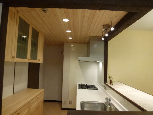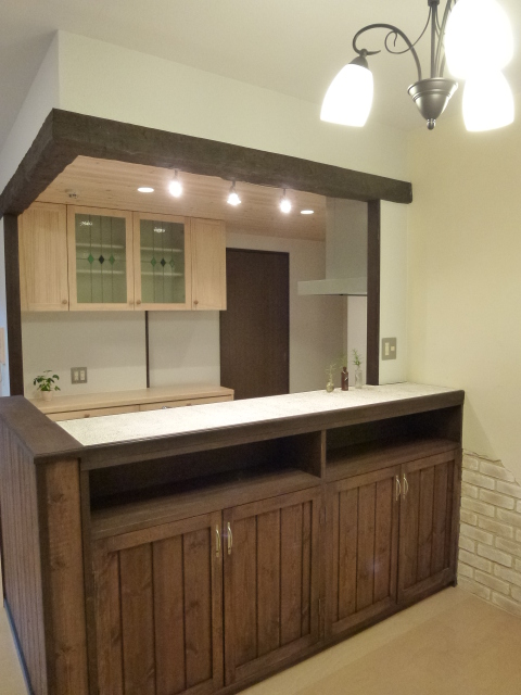 | 【Before】 【施工中】 キッチン台を組み、古材も取付け、LD側のカウンターもインストールして周辺を造作 仕上げ:弊社インテリアコーディネーターが詳細を現場で指示 古材に合わせて周りの造作家具なども自然塗料リボス+京都山中油店の鉱物顔料で着色 左官:カウンター天板、袖壁 天板の左官:クリスタルインレイ使用、蜜蝋で撥水加工 袖壁の左官:スイス漆喰、カルクウォール、エイジング加工 【After】 |