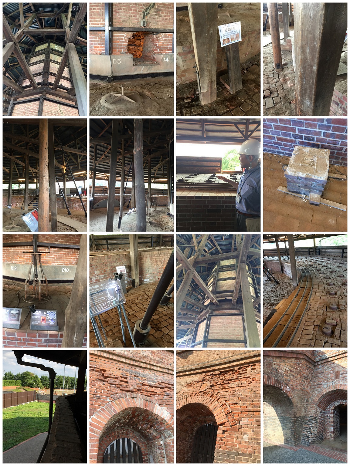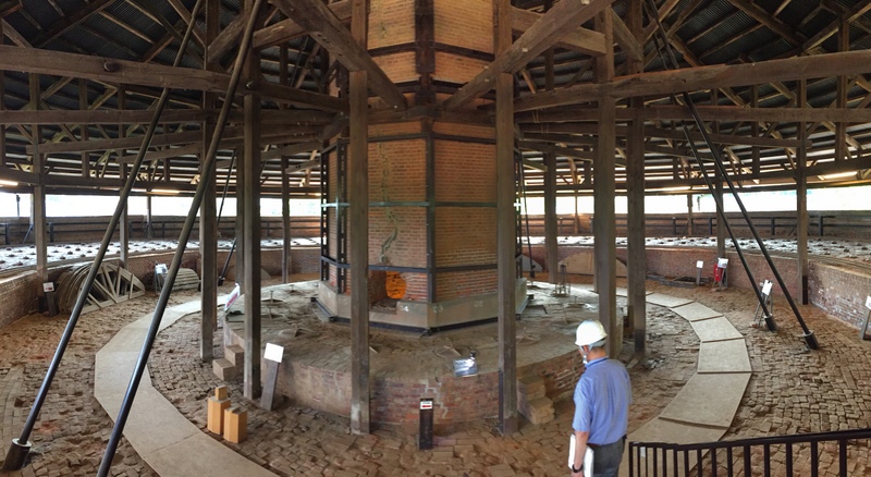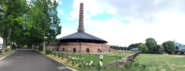 栃木県下都賀郡野木町にある「野木町煉瓦窯」は、この地で操業していた「旧下野煉化製造会社の煉瓦窯」で、明治23年に作られました。効率の良い煉瓦窯は、ドイツ人技師ホフマンにより「ホフマン式輪窯」と呼ばれています。円形に見える外観は、十六角形で、入口の付いた16室の窯から出来ています。明治23年(1890)から昭和46年(1971)まで第二次世界大戦の末期を除き約80年の長い間、稼働してきました。窯の火が順番に点火することで、未焼成煉瓦の搬入から予熱、焼成、冷却、搬出までを連続的かつ繰り返し行えるようになっています。1回に約17,000本、円形の窯を時計回りに点火し全ての窯を連続して使用すると1周で約27万本の赤煉瓦が生産可能でした。煉瓦窯内の見学は、野木町のボランティアガイドによる解説付きのツアーで参加できます。まずは1階の窯内部に入ります。窯の内部は煉瓦で16部屋に仕切られていますが、未焼成の煉瓦を天井まで積み上げて赤煉瓦を焼成していました。天井に開いた四角い穴があり、後半に見学する上の階の「投炭孔」から粉炭を投じていました。窯の内部は空気の流れを仕切るために新聞紙を張り合わせた大版の紙を窯と窯との間に使っていました。1階の窯内部からいったん外階段を上っていく上の2階に上ると、中央には天井までそびえる煙突が伸びておりダンパーの開閉により空気の流れを調節していました。床には鋼製の丸い蓋がいくつも並んでいますが、これが先ほどの窯内部に粉炭を投じる「投炭孔」と呼ばれるものです。ここから下の窯へ燃料となる粉炭を投げ入れていました。その両脇には粉炭を運んだトロッコのレールも残されています。このホフマン式輪窯は、昭和26年には全国に26基ありましたが、現存するのはわずか4基となりました。そのひとつがこの「野木町煉瓦窯」であり、初期の建築様式である円形のものはここ以外にはありません。この日本の近代化における時代の産業遺産として貴重な煉瓦窯は、昭和54年(1979)に国の重要文化財に指定され、平成19年(2007)には「近代化産業遺産群」の一つに選定されました。煉瓦窯の平成の修復工事は、平成28年春に完工いたしました。この煉瓦窯は、創業時から120余年経過した現在でも、ほぼ原型のままで現存しており、建造物としての価値が高いといえます。