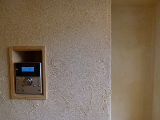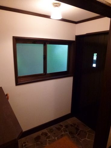 改築後(廊下)杉の古材柱を廊下でも活用、手洗いをしつらえ、トイレも増設。内装はスイス本漆喰左官&ドイツ・ウッドチップクロス張り