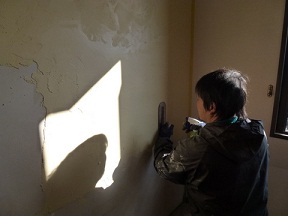 改装中:青木さんの地松の古材梁を2本活用、ドイツ・リボス自然素材塗料で綺麗に蘇る。