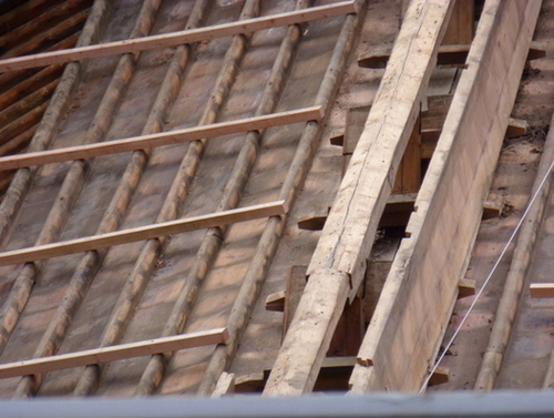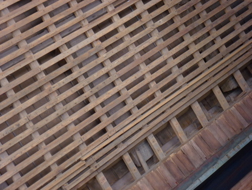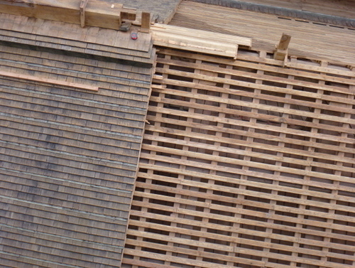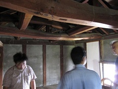当時の貫工法(在来工法の原型)や竹小舞の土壁。地場の欅と松の曲がり梁が素晴らしい。