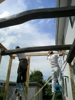 改装中:青木さんの地松の古材梁を2本活用、ドイツ・リボス自然素材塗料で綺麗に蘇る。
