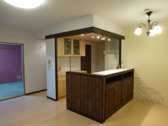 | 【Before】 【施工中】 キッチン台を組み、古材も取付け、LD側のカウンターもインストールして周辺を造作 仕上げ:弊社インテリアコーディネーターが詳細を現場で指示 古材に合わせて周りの造作家具なども自然塗料リボス+京都山中油店の鉱物顔料で着色 左官:カウンター天板、袖壁 天板の左官:クリスタルインレイ使用、蜜蝋で撥水加工 袖壁の左官:スイス漆喰、カルクウォール、エイジング加工 【After】 |