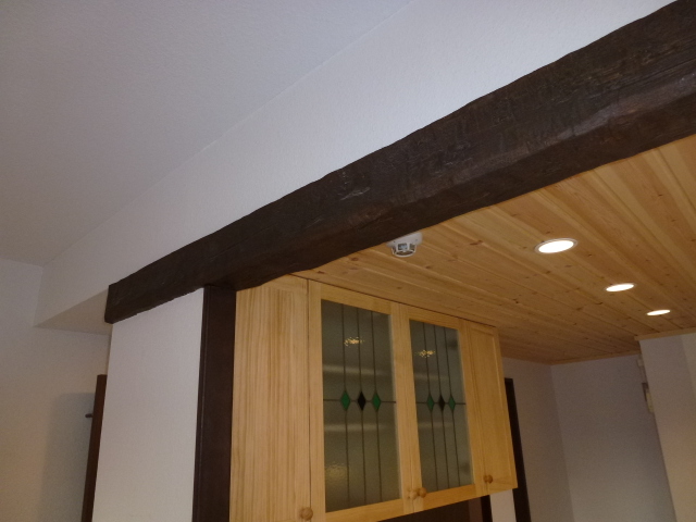 改装中:青木さんの地松の古材梁を2本活用、ドイツ・リボス自然素材塗料で綺麗に蘇る。