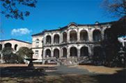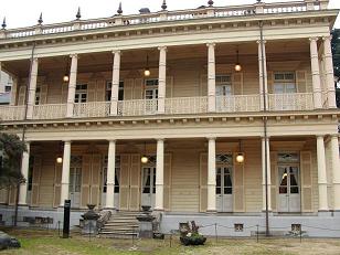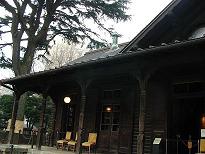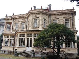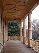 洋館:ジョサイア・コンドルの設計により、明治29年(1896)年に完成しました。完成当時の岩崎邸は、15、000坪の敷地に20棟以上の建物があった。現存する3棟のうちの1棟が、木造2階建・地下室付きの洋館で明治期の上層階級の邸宅を代表する西洋木造建築です。17世紀の英国ジャコビアン様式が基調でルネッサンスやイスラム風のモティーフが採り入れられています。洋館南側は列柱の並ぶベランダで、1階がトスカナ式、2階がイオニア式の列柱が特徴で、米国ペンシルヴェニアのカントリーハウス調のイメージも採り入れています。