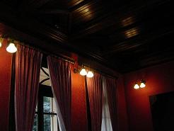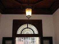 禅寺の「火燈窓」がモチーフのドア上の装飾。 ルネッサンスの象徴「ステンドグラス。 110年前の照明。 トイレも水洗であった。