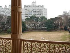 ベランダ:イスラム調のタイルが敷き詰められている。敷地の向こうに見える湯島ハイツ、その右に湯島天神がある。