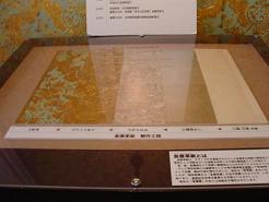 旧岩崎邸で蘇った金唐革紙『金唐革紙』とは、江戸時代にオランダから入ってきた皮革工芸品を真似て、和紙で作られたものである。欧米では皮革工芸品を『金唐革』と呼び、宮殿、市庁舎など室内を飾る高値な壁装材であった。横様を彫った型を皮革に重ね合わせてプレスし、金属箔を全面に張り、塗料を塗った大変豪華なものである。鎖国時代に輸入された金唐革は日本では手箱や刀の柄、鞍、煙草入れなどに使われ、珍重されたものである。明治期の日本で大蔵省印刷局が中心に製造し輸出された金唐草紙はウィーン万国博覧会、パリ万国博覧会で好評を博し、欧米の建築物を彩った。日本では明治の洋風建築に幾つか見られ、明治29年東京下谷区茅町にジョサイヤ・コンドルの設計により建てられた、三菱創設者・岩崎家本邸のココ、2階客室2部屋に、現在この金唐革紙が貼られている。