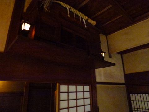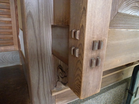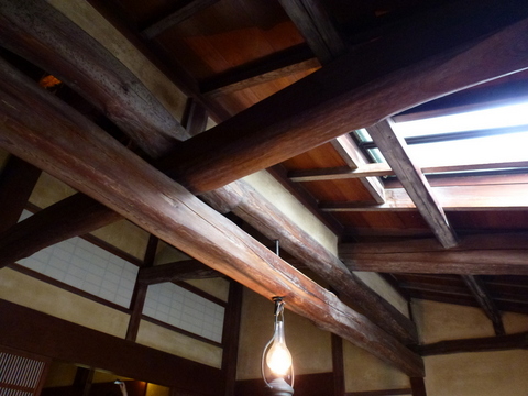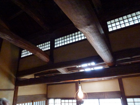 当時の貫工法(在来工法の原型)や竹小舞の土壁。地場の欅と松の曲がり梁が素晴らしい。