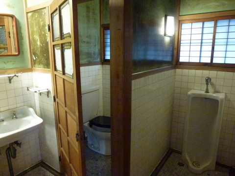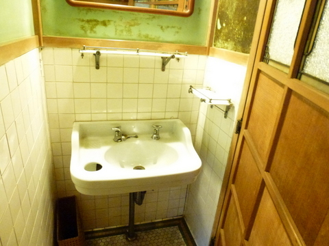 改築後(廊下)杉の古材柱を廊下でも活用、手洗いをしつらえ、トイレも増設。内装はスイス本漆喰左官&ドイツ・ウッドチップクロス張り