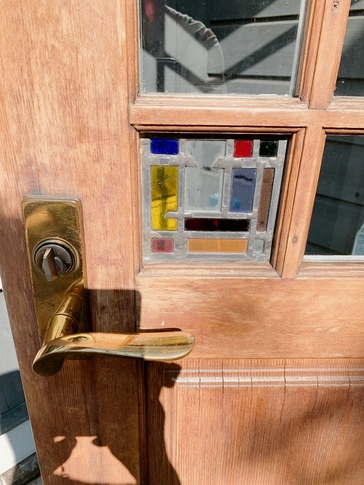 改築後(廊下)杉の古材柱を廊下でも活用、手洗いをしつらえ、トイレも増設。内装はスイス本漆喰左官&ドイツ・ウッドチップクロス張り