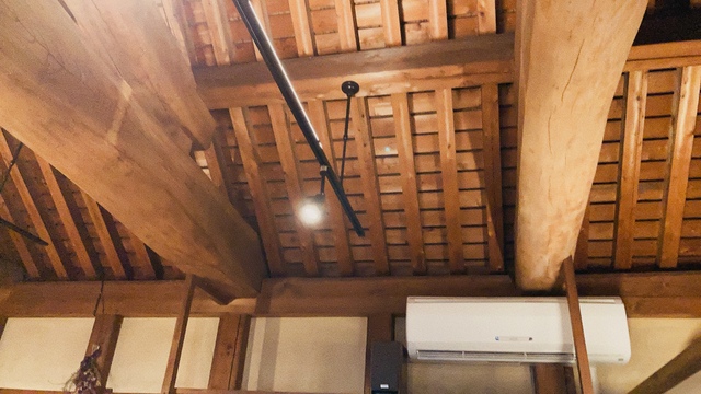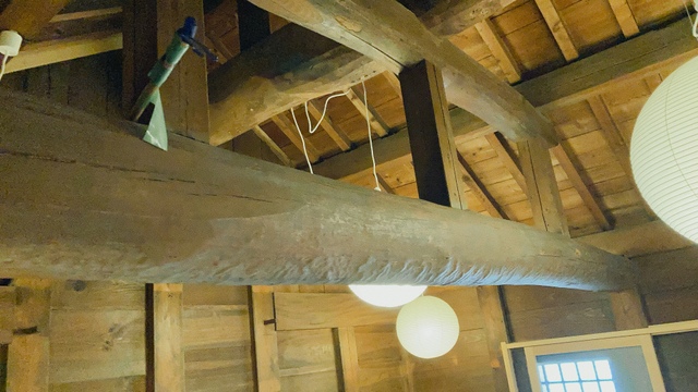 当時の貫工法(在来工法の原型)や竹小舞の土壁。地場の欅と松の曲がり梁が素晴らしい。