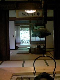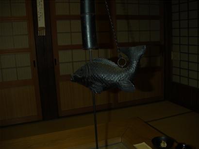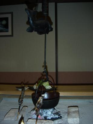 囲炉裏の「引っ掛け物」は魚の形をして、梁から下ろされた棒に引っ掛けて高さを合わせた。