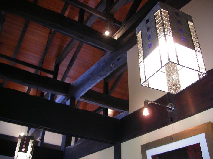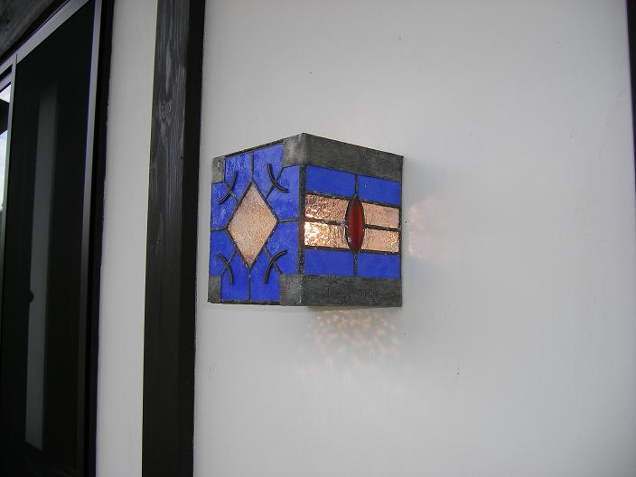 3本の梁が玄関ピロティーに突出る(↑玄関側・↓居間側)、漆喰壁と玄関照明のステンドグラスの青のコントラストが美しい。