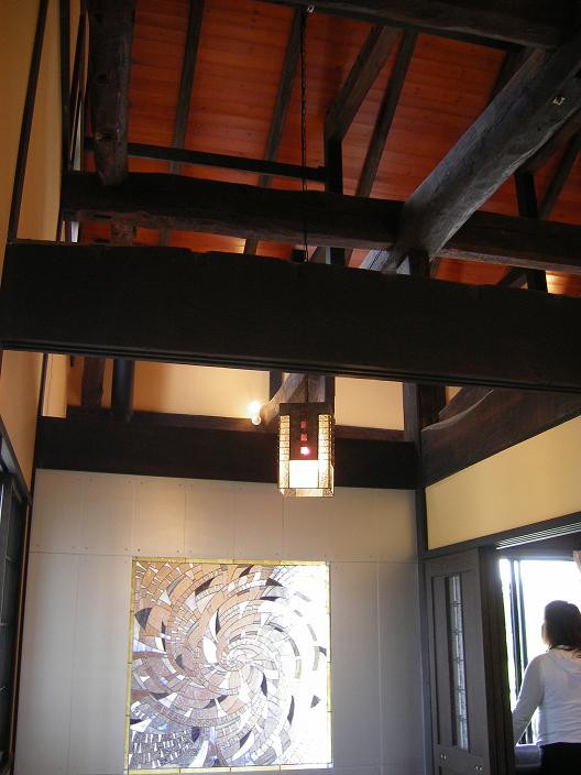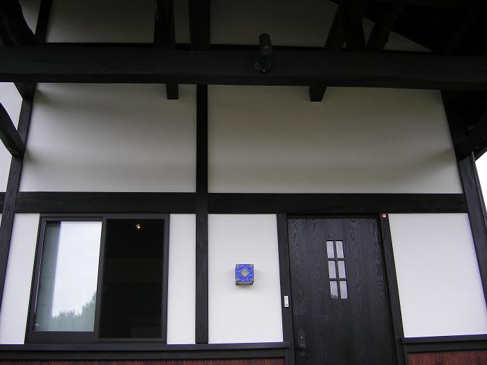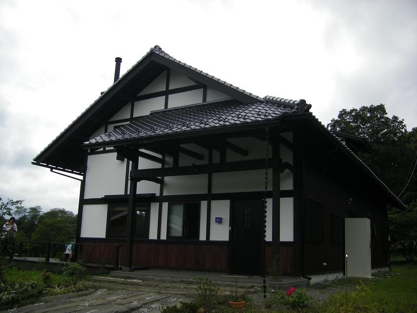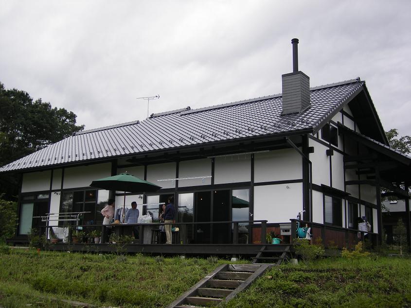 夏休み最後の土曜日で賑わう那須高原の幹線道路から少し東に入った静かなところに、今回の藤田邸はありました。約100年の推定築年数のこの民家は北杜市(旧北巨摩郡高嶺町)より昨年移築された民家で奥の座敷部分は増築されています。増築部分は新材が多く使われていますが、なぐり加工の廊下の楢板など、昔のチョウナ跡を連想させる仕上げになっていました。1階床面積が41坪のこの建物は那須連邦からの強い風に抵抗するかのように濃く塗られた杉板と本漆喰の白のコントラストが美しい大壁仕上げ。茶臼岳を望むために設けた2階小部屋にはアルケドアティス網野さんが多様される突き上げ屋根でこの再生民家の特徴になっています。地場の火山質の石を用いたアプローチから玄関に向かうと、きりりとした漆喰に網野さんの奥さんデザインの鮮やかな青のステンドグラスが我々を迎えてくれました。ドアを開けると、伝統工法の小屋組みの直下にオブジェとしてステンドグラスをはめ込んだメタリックな壁がハロゲンライトできらりと輝き絶妙な色彩を醸し出しています。建具を開け中に入ると、力強い小屋組み構造を見上げると主要構造材、板材、造作材にはケヤキが多用されていました。ドイツウッドコートで着色された柱と無塗装の梁の濃茶には、違和感が全くない仕上がりで大変美しい。日中には、やや黄褐色に見える塗り壁は、夕方の傾斜光でややオレンジ色にそして夕刻には、陰影が美しい間接照明と、床からの反射光でより暖色に変化するよう、巧みに照度計算されています。床は、廉価なタイルに間違えられない大判の赤御影石で眠り目地、面取り仕上げ。この暖色系の室内をもつ藤田邸が「紅石荘」と名づけられた由縁です。実はこの床にはもう一つの仕掛けが備えられている。「パシブソーラー」である。冬の日射はかなり奥まで差込み、北側のキッチンの冷蔵庫辺りまで差込み、日中蓄熱される。冬の間もこのパッシブソーラーの輻射熱を補充暖房に使い、あとは一台の撒きストーブで十分と施主の藤田さんは言う。設計者の網野さんは「民家形式のこの大きな空間ならば、温風暖房は効率が悪い。断熱構造の建物にパッシブソーラーの輻射熱利用が適していた」と言います。私たちは、時折、涼しくなった風の心地よさと澄んだ空気をいっぱい吸い込み、夏の終わりの那須高原の四季折々をパッシブに暮らすこの新古民家、「紅石荘」を知る素晴らしい見学会となりました。