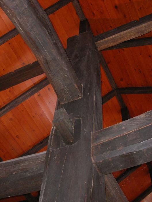構造材のほとんどがケヤキ。古材は着色せず清掃だけ。柱と梁の接合部は長ほぞ、込み栓。座敷にあった違い棚は居間に配置。