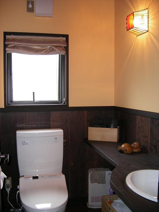 大黒柱・梁:ケヤキ材 床:赤御影石 トイレは杉板と漆喰壁の組合わせ