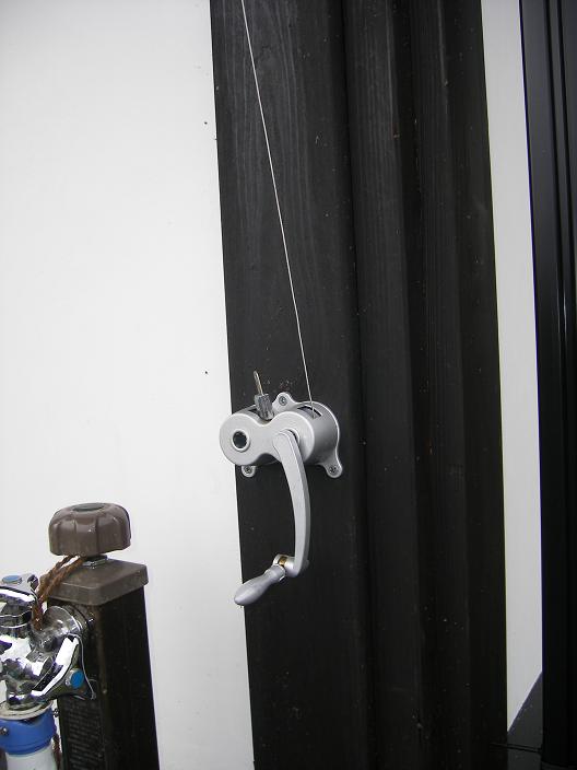 南側ウッドデッキにある物干しは、オーナー藤田さんの自作でリールで上下させる。