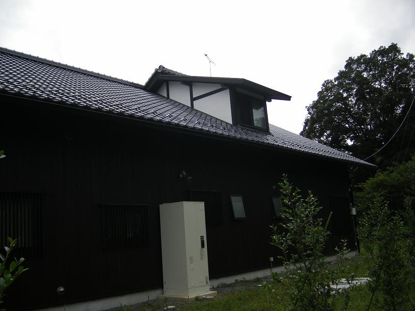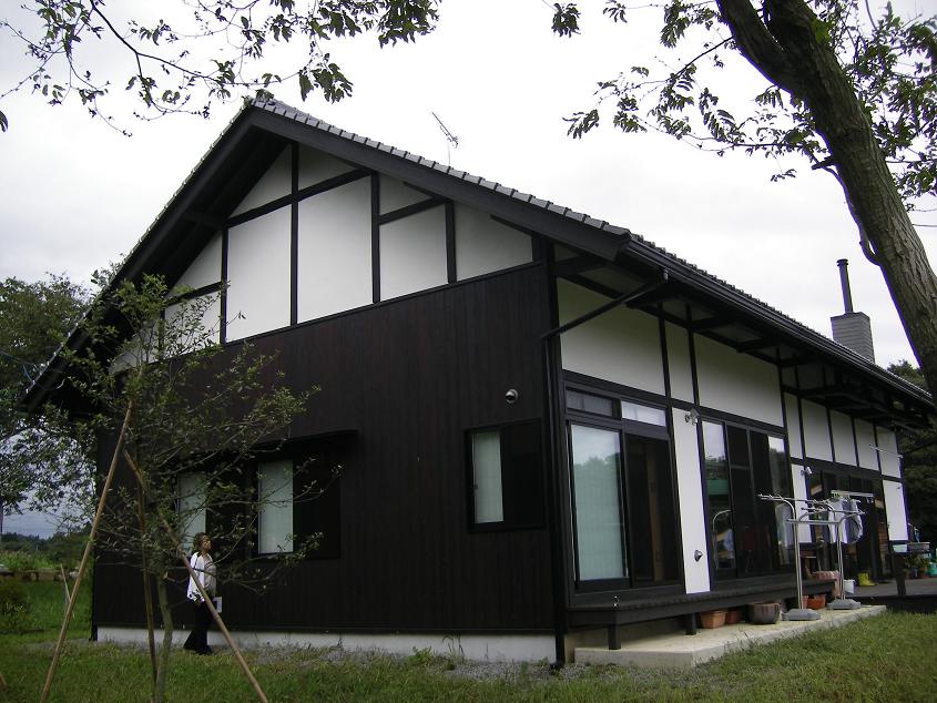 瓦屋根に漆喰壁、杉板(ドイツ:ウッドコート仕上)の外観、北側の突き上げ屋根から特徴茶臼岳の眺望がいい。