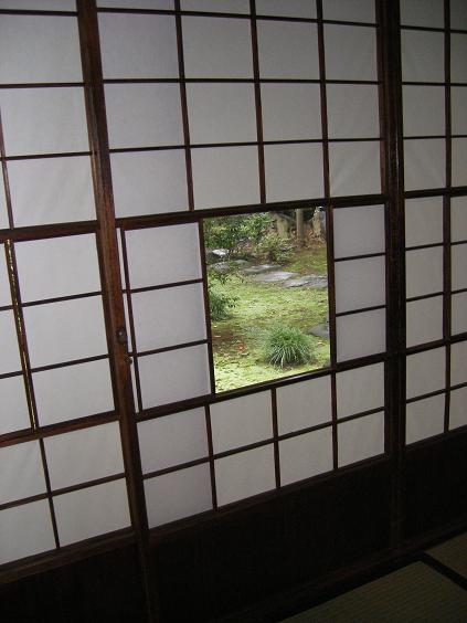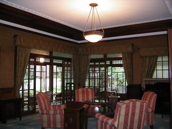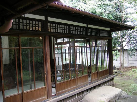 現在の玄関は安田氏のものとなった後に増築されたもの。庭から居間側を見る。大正期の手漉き硝子が美しい。
