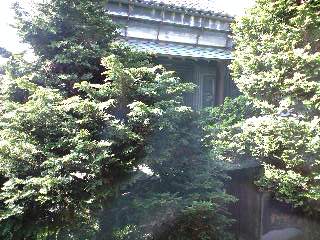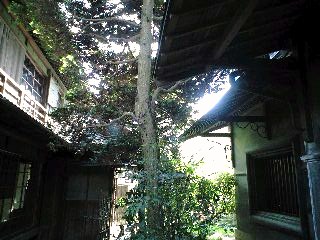 杉板の外壁は弁柄入りの古色、転着剤に柿渋を使っている。主家と土蔵の間から、木漏れ日が差し込む