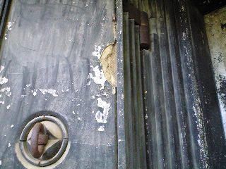 土蔵の防火扉、木と鉄と土でできている 良材で作られた軒裏と屋根棟瓦は建築当時のまま。