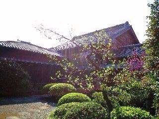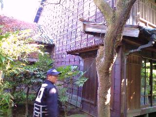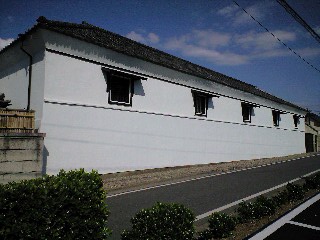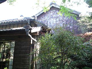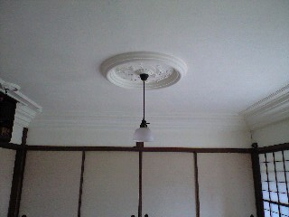 室内撮影は禁止、御免なさい・・・ここだけです!和洋折衷のこの部屋の天井照明の吊り元には鏝絵が! 南側の長い外塀に漆喰の白さが際立っていた