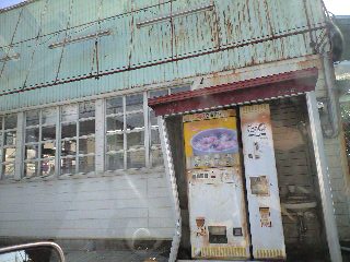 白い漆喰壁をJR線路方向に進むと、古い建物に昔懐かしい【日清カップヌードル】の自販機が!お湯出るの?