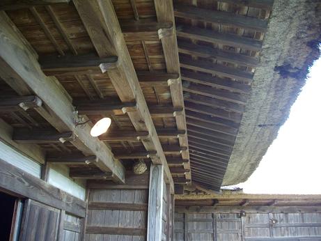 当時の貫工法(在来工法の原型)や竹小舞の土壁。地場の欅と松の曲がり梁が素晴らしい。