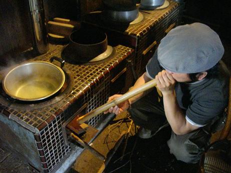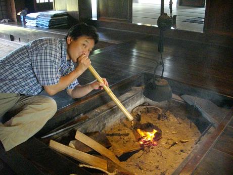 農村体験その②:昼食は各自、自炊で・・・囲炉裏に火を入れ、土間には 五右衛門風呂がそのまま残されています